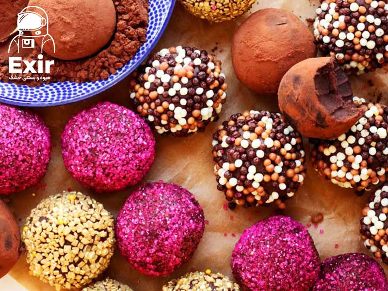 - ترافل بلوبری: ترکیب شکلات سفید یا تلخ با پودر بلوبری یا مقدار کمی پوره میوه، ترافلی با رنگ ملایم و طعم میوهای دلپذیر ایجاد میکند.