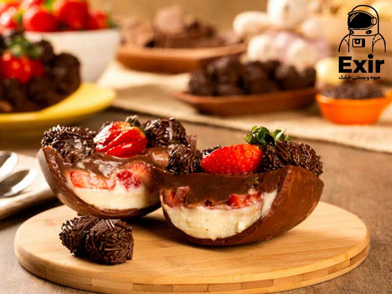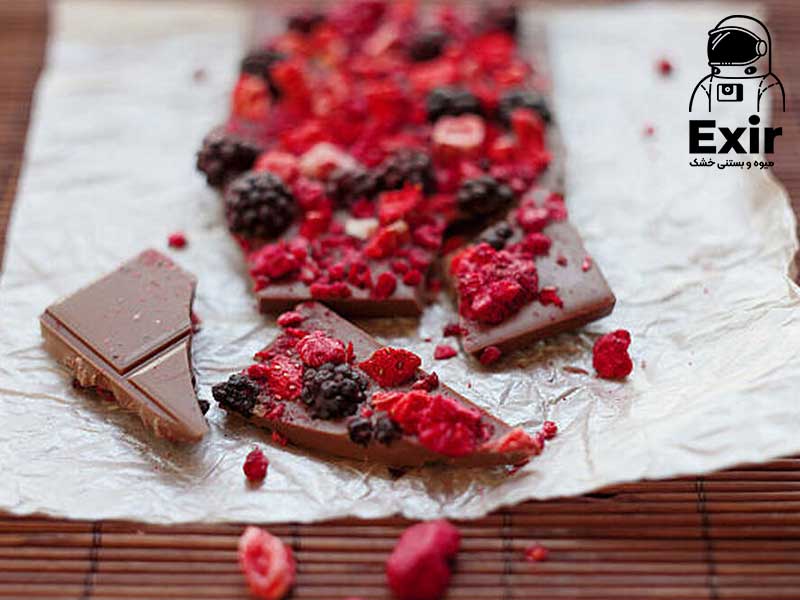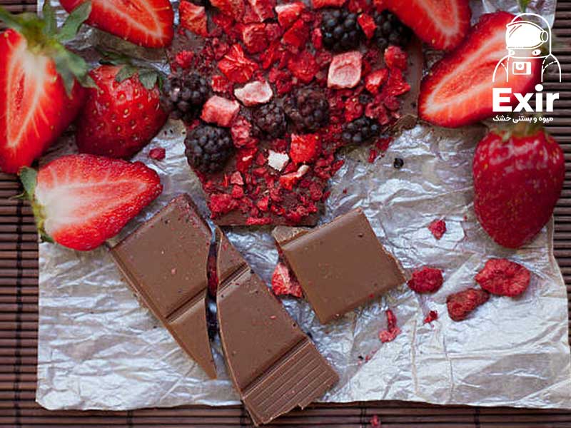 در مرحله بعد، میوهها، از توتفرنگی و بلوبری گرفته تا انواع تمشک، باید کاملا تازه، خشک و سالم باشند. کوچکترین رطوبت روی میوه، باعث میشود روکش شکلات بهدرستی نچسبد. در برخی محصولات، از میوه خشک شکلاتی یا میوههای نیمهخشک استفاده میشود تا طعم غلیظتر و ماندگاری بیشتری ایجاد شود. این موضوع، علاوهبر حفظ طعم، به بهرهمندی از خواص میوههای خشک نیز کمک میکند.